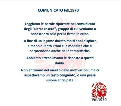 Leggiamo le parole riportate nel comunicato degli "ultras roseto", gruppo di cui veniamo a conoscenza solo per la firma in calce.La fine di un legame...