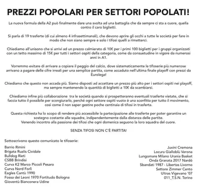 Prezzi popolari per settori popolari: la richiesta dei gruppi delle tifoserie di A2