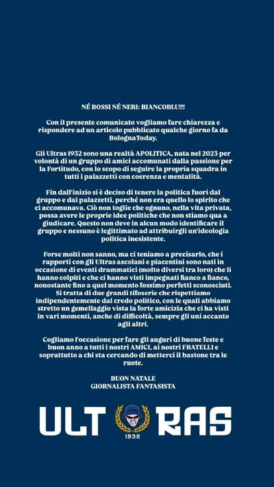 Comunicato Ultras 1932: né rossi né neri, biancoblu!