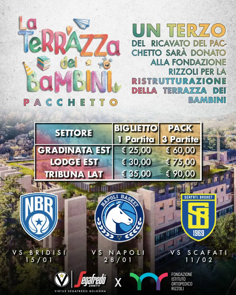 Insieme alla vendita dei singoli biglietti, è disponibile un pacchetto speciale che comprende le tre gare di LBA (Brindisi, Napoli e Scafati) ad un prezzo dedicato. Il pacchetto “La Terrazza dei Bambini” nasce dalla collaborazione tra Virtus Segafredo e la Fondazione Istituto Rizzoli con il fine di devolvere un terzo del ricavato del pacchetto di tre partite alla Fondazione Rizzoli per la ristrutturazione della Terrazza dei Bambini.
