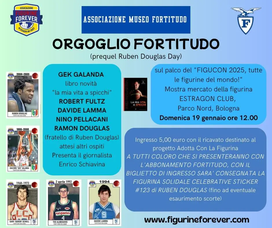 FIGUCON 2025 apre al pubblico alle ore 10.00. Ingresso 5,00 euro con figurina solidale Celebrative Sticker dei campioni dello sport in omaggio. Solo per gli abbonati Fortitudo, fino alle ore 12,30 e fino ad eventuale esaurimento scorte, sarà consegnata con il biglietto la figurina solidale di Ruben Douglas. Sarà necessario mostrare l'abbonamento.
