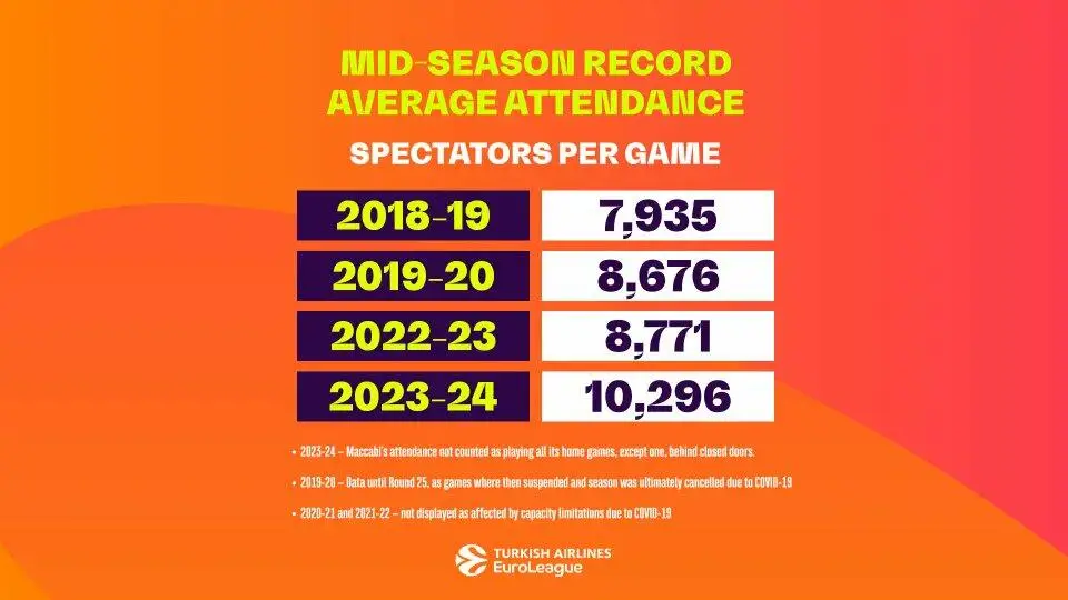 La passione di una partita di EuroLega si riverbera in tutto il mondo e sempre più tifosi vogliono prendere parte all'azione. Solo questa stagione ha visto un aumento del 17,4% nelle presenze nei primi 17 turni, con una media record di 10.296 tifosi ad ogni partita di EuroLega. Rispetto alla scorsa stagione si tratta di un aumento di 1.525 spettatori a partita.
