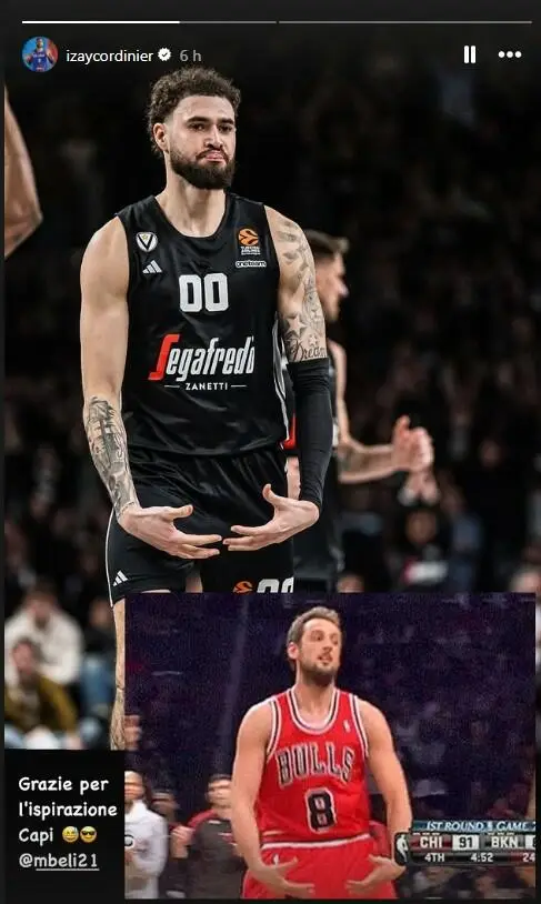 Nel finale di ieri sera, dopo una tripla segnata, Isaia Cordinier ha esultato con il gesto “degli attributi”. Con una storia Instagram il francese ha poi ricordato quando lo stesso gesto lo fece Marco Belinelli, nel 2013, ai tempi dei Chicago Bulls, scrivendo “Grazie per l'ispirazione Capi”.