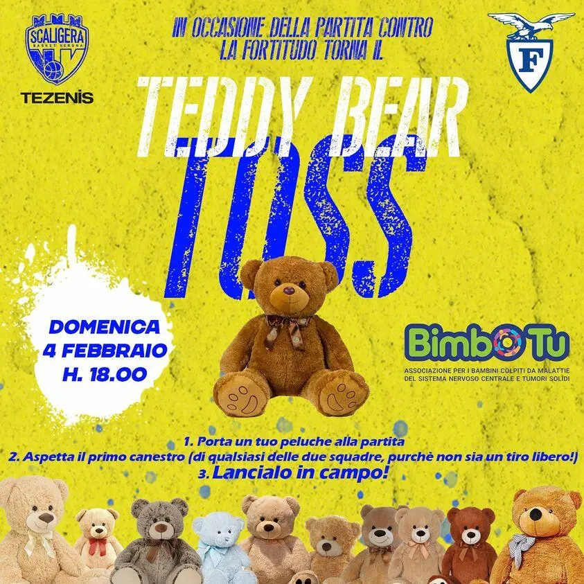 Tale attivitΓ prevede che gli spettatori del match portino al Pala AGSM AIM uno o piΓΉ peluches morbidi e puliti e che essi vengano lanciati in campo al primo canestro della partita (di una delle due squadre e purchΓ¨ non sia un tiro libero). Tutto il materiale raccolto verrΓ sanificato e consegnato da Scaligera Basket allβAssociazione Bimbo Tu di Bologna, luogo dove Dylan Γ¨ stato accolto e supportato durante il suo periodo di malattia. Bimbo Tu Γ¨ una realtΓ non profit che si impegna dal 2007 ad offrire sostegno a ragazzi affetti da patologie del sistema nervoso centrale e alle loro famiglie.