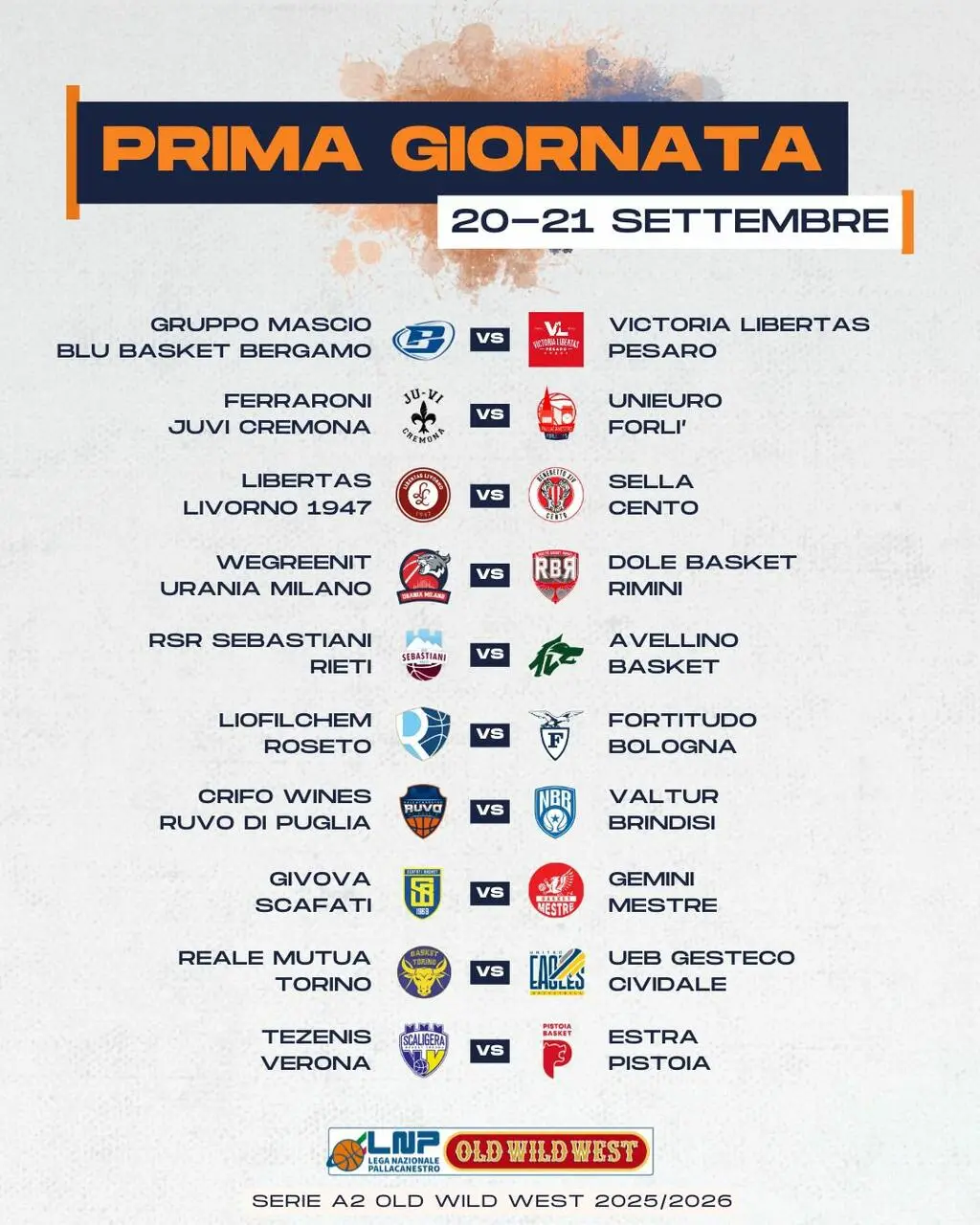 In accordo con il Settore Agonistico FIP si invia in allegato il banner con il calendario della prima giornata di Serie A2 Old Wild West 2025/26, in programma sabato 20 e domenica 21 settembre.