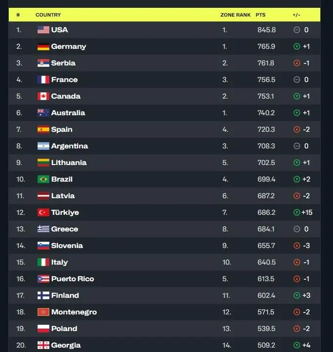In testa sempre gli USA, al secondo posto la Germania, che supera la Serbia. La Spagna perde due posizioni, scivolando al settimo posto.