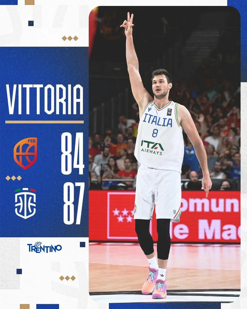 Così il CT Gianmarco Pozzecco: “Siamo molto felici. Abbiamo giocato una partita solida contro una squadra molto importante e su un campo complicato. Non so cosa succederà ora in Portorico ma questi ragazzi giocano con ardore e soprattutto con un legame per la Maglia Azzurra che è commovente”.