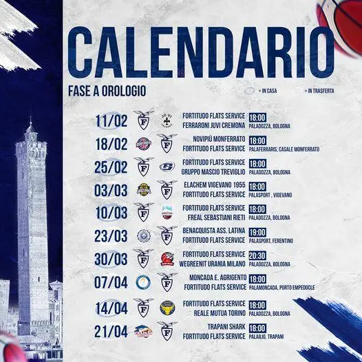 La fase a orologio si aprirà domenica 11 febbraio, con la Fortitudo Flats Service di coach Attilio Caja subito impegnata al PalaDozza, contro la Juvi Cremona, squadra classificatasi quinta nel Girone Verde.