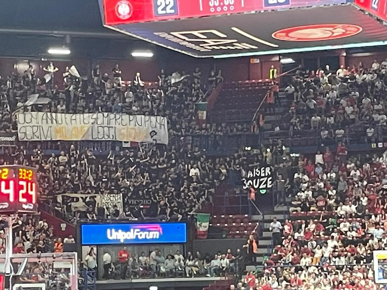 Ogni anno fate sempre più pena, scrivi Milano leggi Siena, lo striscione esposto dalla curva dei tifosi Virtus in occasione di gara 4.