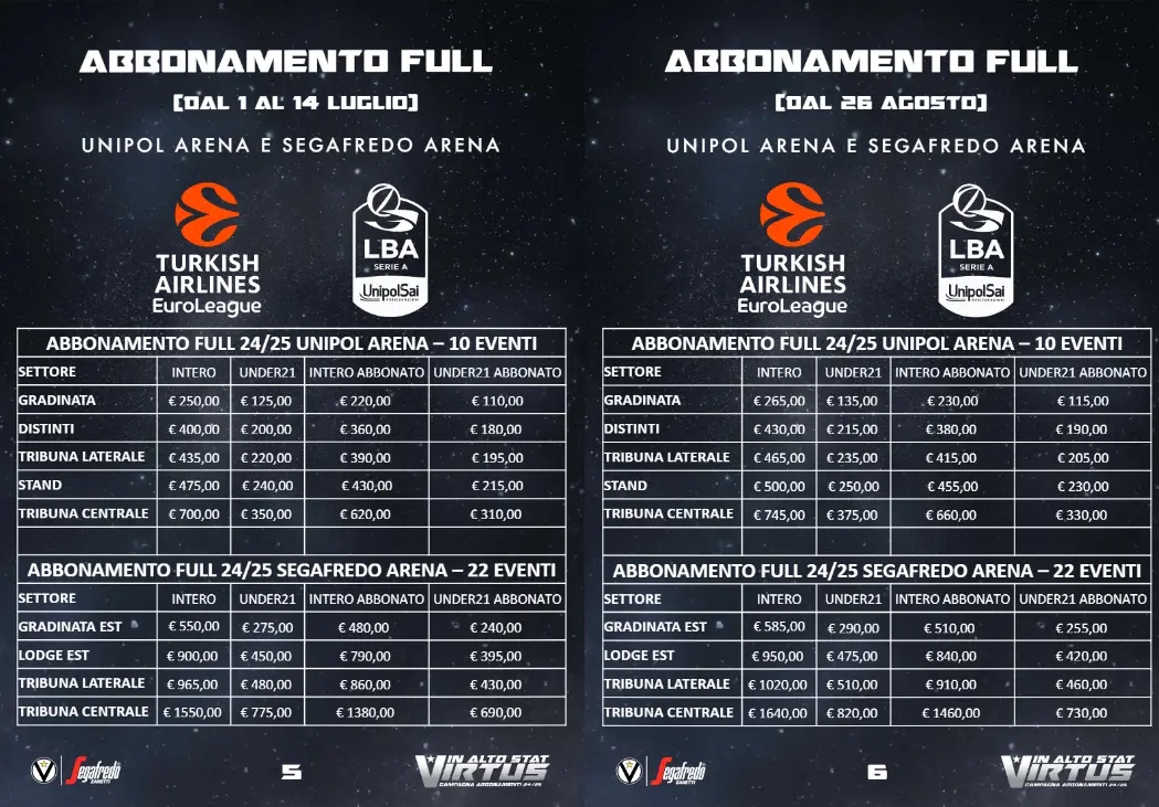 Qui tutte le informazioni e i prezzi => https://www.virtus.it/acquisto-biglietti/in-alto-stat-virtus-campagna-abbonamenti-stagione-2024-25/