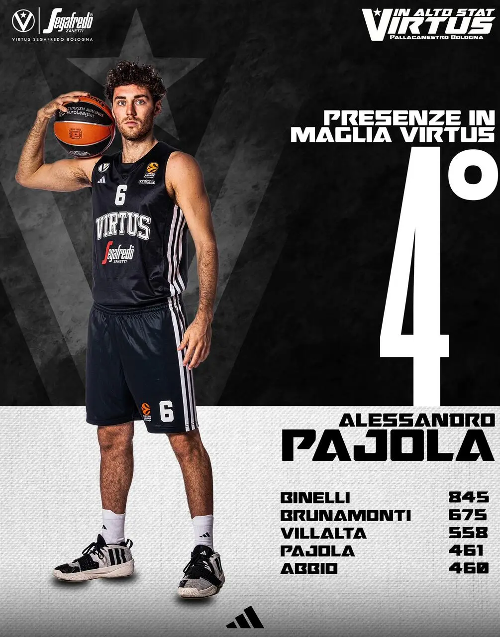 Home / Virtus Pallacanestro Bologna Alessandro Pajola quarto di sempre per presenze in maglia Virtus Ufficio Stampa Virtus Pallacanestro / 15 January 2025, 19:26 Twitter Facebook Whatsapp Telegram Email UN ALTRO GRANDE TRAGUARDO PER 𝙋𝘼𝙅𝙊 Quarto di sempre per presenze in maglia Virtus Oggi su Rete8 qsvs (canale 81 del dtt) "Basket Land", alle ore 22 La Fortitudo viene sconfitta a Teramo e retrocede