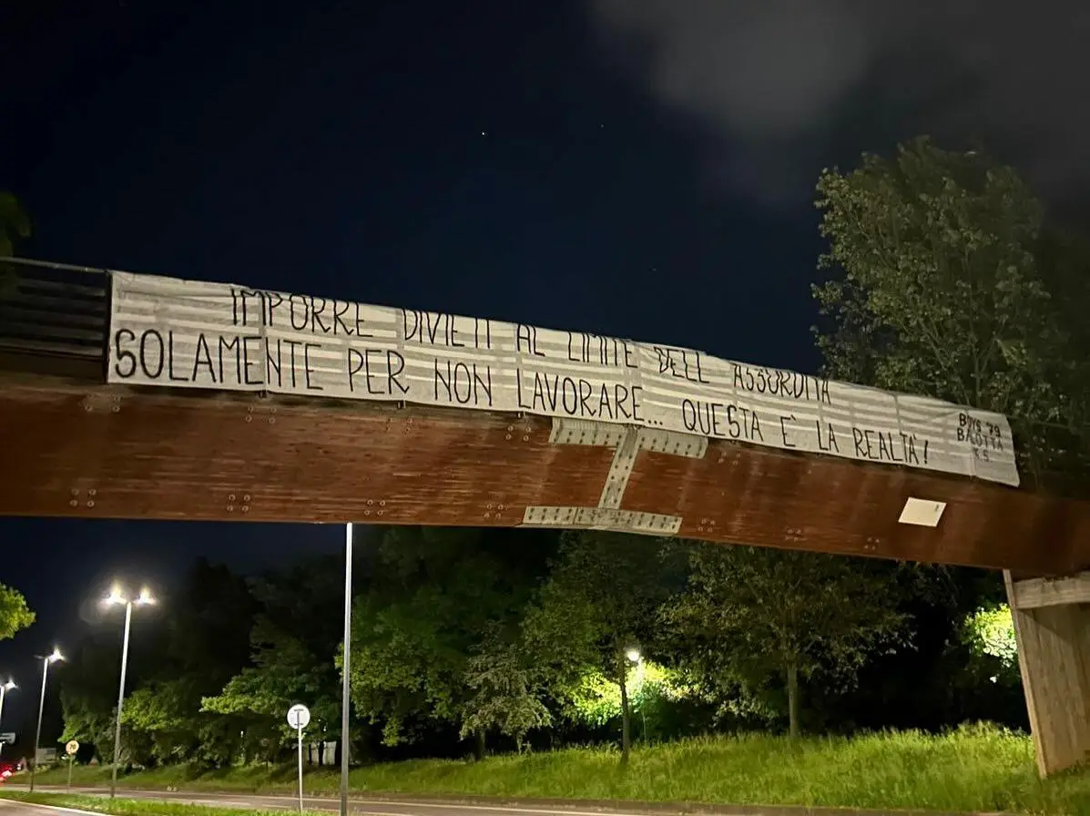 Dopo il divieto di trasferta imposto dalle Aurorità per Pistoia, la Curva Virtus ha appeso questo striscione, firmato dai gruppi Boys 79, Balotta e K. S.