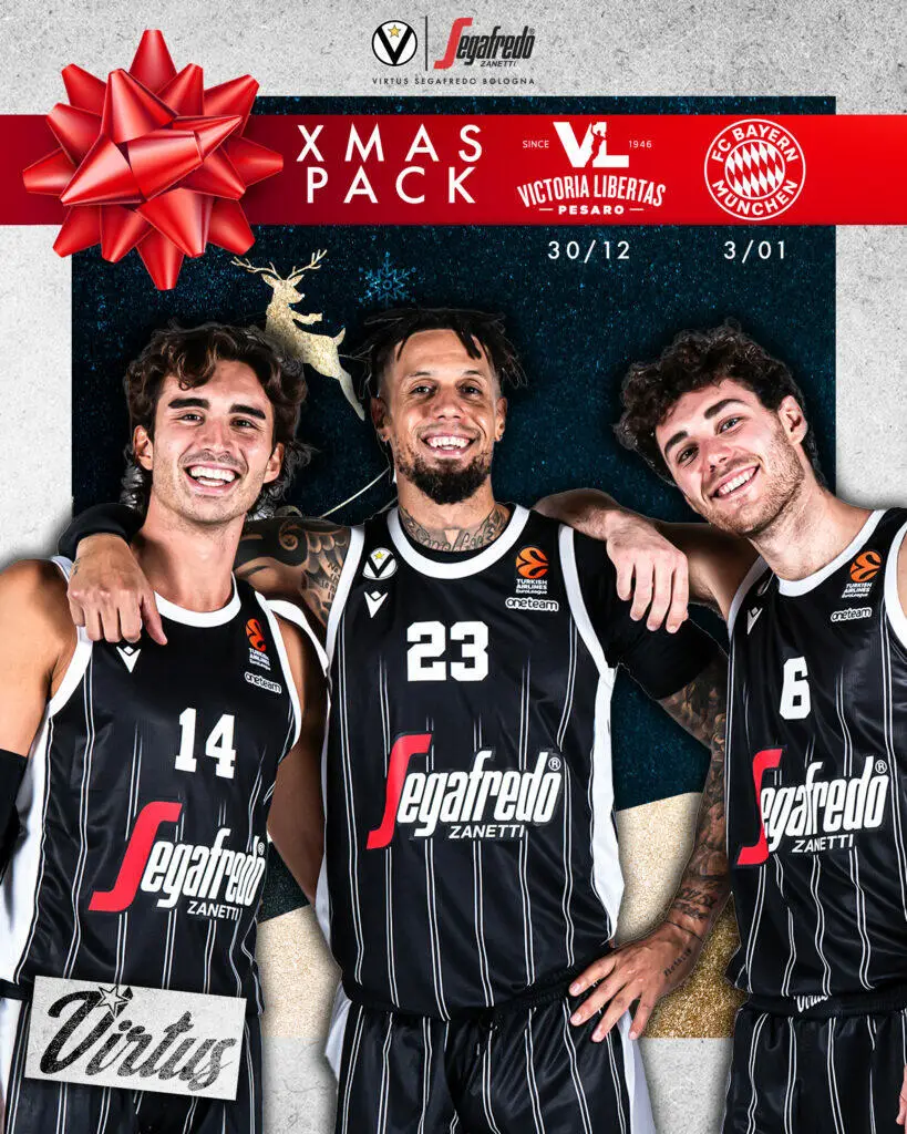 Per le due gare casalinghe durante le festività natalizie, Virtus Segafredo Bologna ha pensato ad un “Christmas Pack”, un pacchetto che include le due gare contro Pesaro e Bayern ad un prezzo più che conveniente rispetto al costo del singolo biglietto. Anche per il “Christmas Pack”, così come per la normale biglietteria, è prevista un prezzo dedicato agli abbonati della Segafredo Arena della stagione (inserendo il codice di accesso in fase di acquisto) e un prezzo dedicato ai non abbonati.