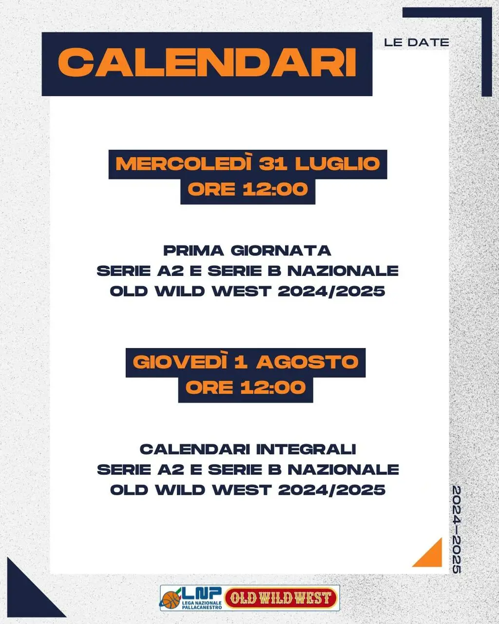 Lega Nazionale Pallacanestro, in accordo con il Settore Agonistico FIP, comunica che i calendari integrali della Serie A2 e della Serie B Nazionale Old Wild West per lla stagione agonistica 2024/2025 saranno pubblicati giovedì 1 agosto alle ore 12.00.