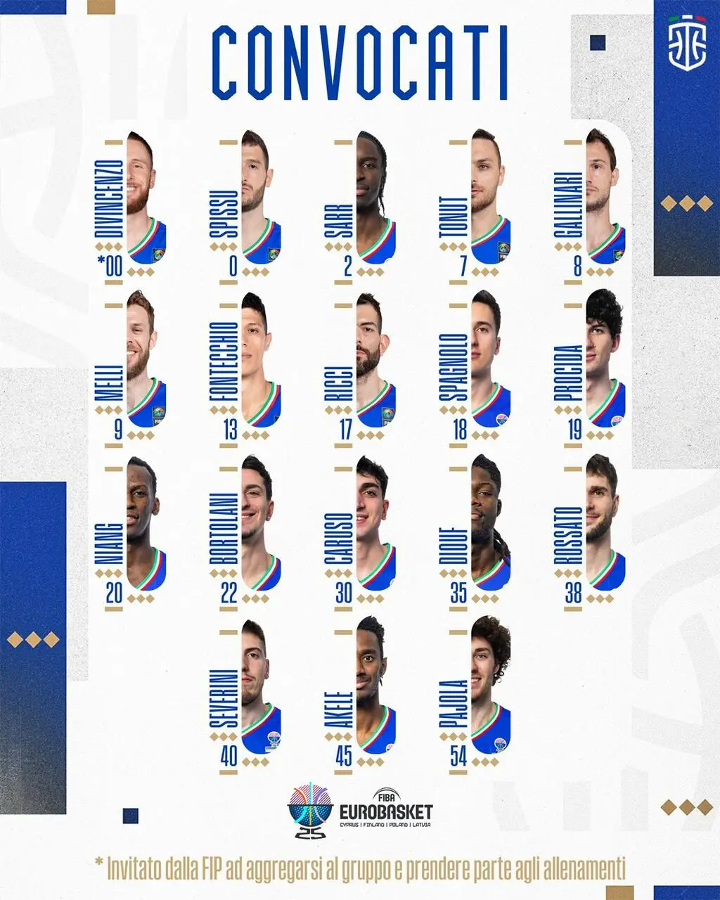 Il Commissario Tecnico Gianmarco Pozzecco ha scelto gli Azzurri per il Training Camp 2025 che si svolgerà a Folgaria (Trento) dal 23 al 31 luglio e che aprirà la preparazione in vista di FIBA EuroBasket (28 agosto/14 settembre) anche con la Trentino Basket Cup (2/3 agosto).