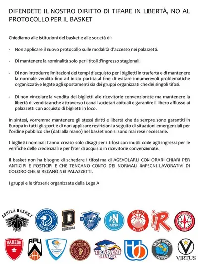 DIFENDETE IL NOSTRO DIRITTO DI TIFARE IN LIBERTÀ, NO AL PROTOCOLLO PER IL BASKETChiediamo alle istituzioni del basket e alle società di: Non...
