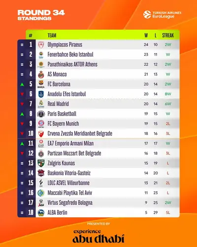 I risultati della 34° giornata di Eurolega e la classifica finale. La Virtus chiude al penultimo posto con il record di 9 vittorie e 25...