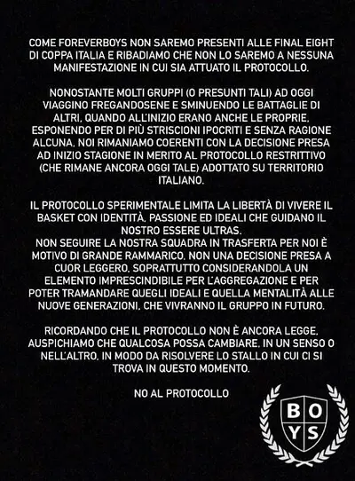 Come FOREVERBOYS non saremo presenti alle Final Eight di coppa Italia e ribadiamo che non lo saremo a nessuna...