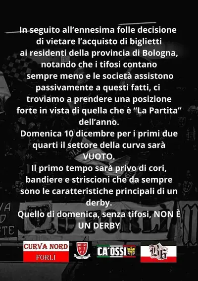 Divieto di trasferta per gli ospiti: Curva Nord di Forli' in sciopero