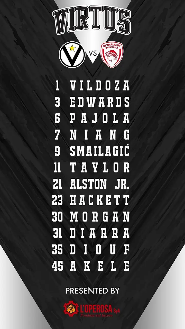Home / Virtus Pallacanestro Bologna Il roster per Virtus - Olympiacos La Redazione / 26 December 2025, 19:48 Twitter Facebook Whatsapp Telegram Email Virtus in campo così alle 20.30 contro l’Olympiacos. RSR Sebastiani Rieti - Flats Service Fortitudo Bologna, il prepartita Halftime: Virtus Bologna - Olympiacos Pireo 41-50