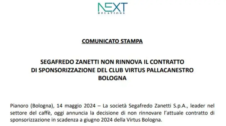 La società Segafredo Zanetti SpA, leader del settore del caffè, oggi annuncia la decisione di non rinnovare l'attuale contratto di sponsorizzazione in scadenza a giugno 2024 della Virtus Bologna.