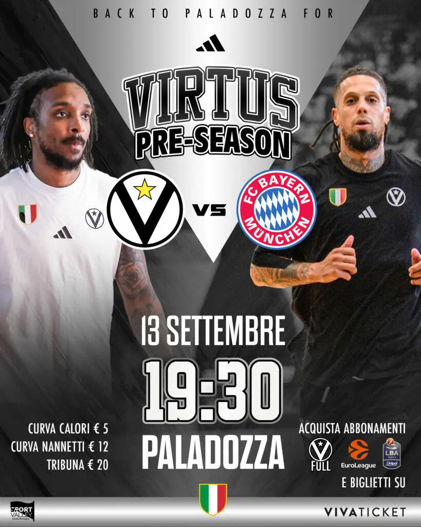 La Virtus Bologna torna al PalaDozza per un test di preseason internazionale. Sabato 13 settembre alle ore 19.30 la Virtus affronterà il Bayern Monaco, in una sfida che anticipa l’atmosfera dell’imminente stagione di Eurolega.