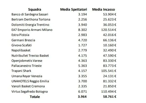 L’EA7 Emporio Armani Milano è il club che ha fatto registrare la più alta media pubblico nella regular season 2024/25 con 8.302 spettatori a partita, seguita da Virtus Segafredo Bologna (6.071) e Pallacanestro Trieste (5.363). 4 le squadre con più di 4.000 spettatori di media: Germani Brescia (4.720), Openjobmetis Varese (4.363), NutriBullet Treviso Basket (4.175) e Trapani Shark (4.157).