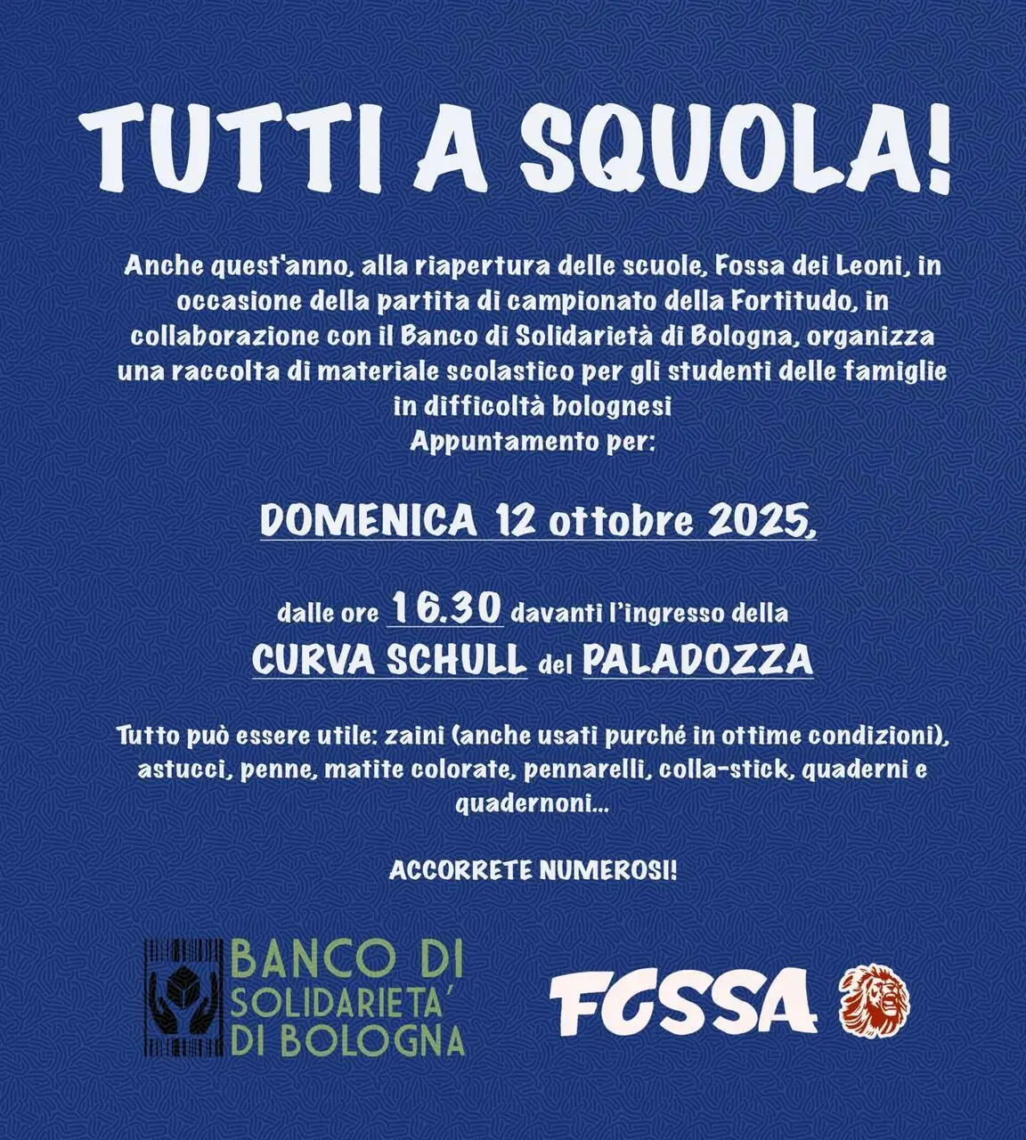 Dalle 16.30 davanti all’ingresso Curva Schull si raccoglie materiale scolastico come: penne, matite, astucci, quadernoni, temperamatite, gomme da cancellare, colla stick, copertine, colori, pennarelli, zainetti (anche usati, purché in ottime condizioni) da poter donare alle famiglie in difficoltà di Bologna!