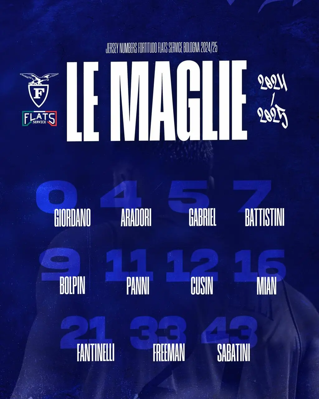 I numeri di maglia per la stagione 2024-25 della Fortitudo Flats Service. Presente nel roster biancoblu Nicola Giordano, non Marco Giuri.