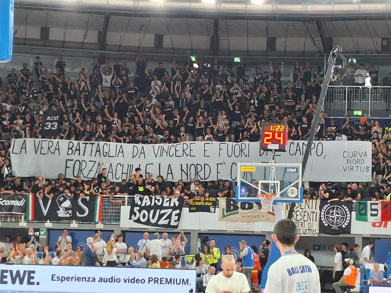 A fine primo quarto, tutto il PalaLeonessa a Brescia ha applaudito lo striscione della curva Virtus per Achille Polonara. La squadra si è presentata al completo con la sopramaglia con il numero 33.