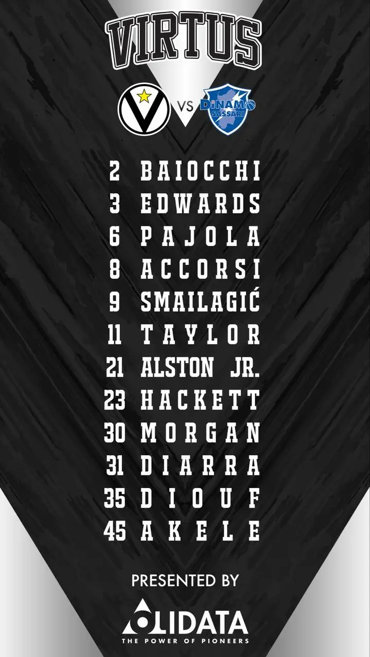 Home / Virtus Pallacanestro Bologna Il roster Virtus per Sassari La Redazione / 26 October 2025, 17:59 Twitter Facebook Whatsapp Telegram Email Virtus in campo così alle 19 contro Sassari Indisponibile Saliou Niang per una sindrome influenzale LBA, i risultati degli anticipi e il programma di oggi Halftime: Virtus Olidata Bologna - Banco di Sardegna Sassari 49-35