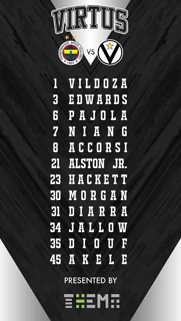Home / Virtus Pallacanestro Bologna Fenerbahce - Virtus, il roster Ufficio Stampa Virtus Pallacanestro / 25 November 2025, 18:03 Twitter Facebook Whatsapp Telegram Email Virtus in campo così alle 18.45 sul campo del Fenerbahce. Cento-Rimini, il prepartita di coach Di Paolantonio Halftime: Fenerbahce Istanbul - Virtus Bologna 30-31