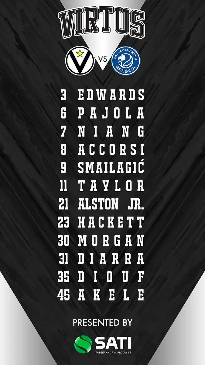 I 12 per Virtus-Brescia. Indisponibili Jallow e Vildoza