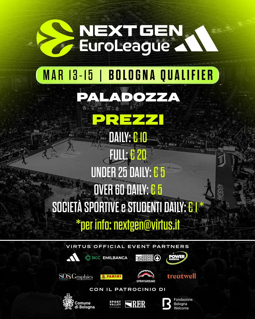 Dopo Stella Azzurra e Varese, l’Adidas NextGen EuroLeague – giunta alla sua 24ª edizione – torna in Italia e più precisamente al PalaDozza di Bologna. Il principale palcoscenico per i migliori talenti europei Under 18 (da qui sono passati giocatori come Wembanyama, Jokic e Doncic per rimanere alle ultime edizioni) rappresenta dunque un’occasione per tutti gli amanti della pallacanestro. Motivo di pregio e orgoglio per la Virtus Pallacanestro Bologna è la presenza tra le 8 squadre anche della propria rappresentativa under-18: la Virtus Emilbanca Bologna.